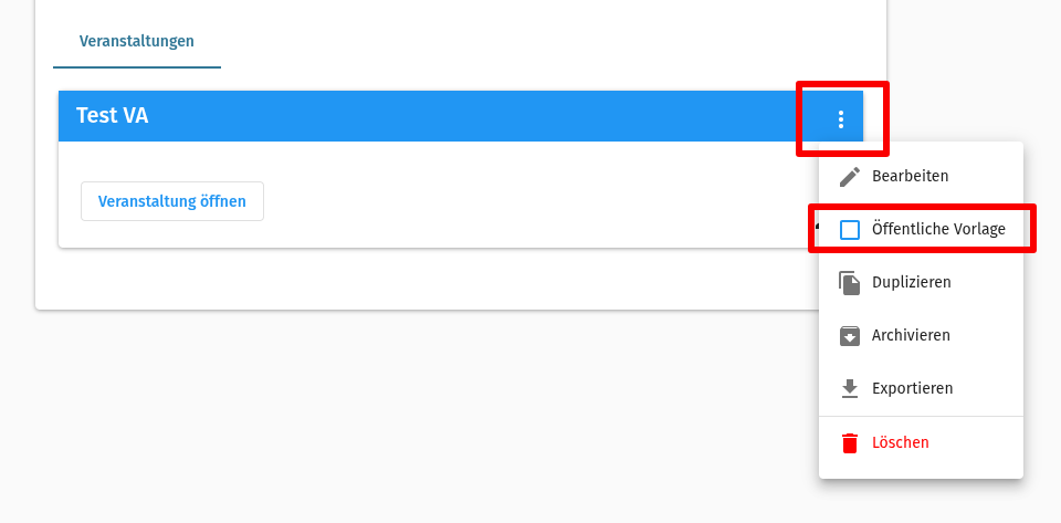 Zur Erstellung einer öffentlichen Vorlage benötigt es eine bestehende Veranstaltung. Diese kann als öffentliche Vorlage markiert und anschließend als Vorlage verwendet werden.